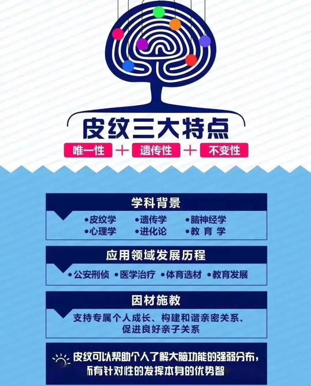 关于皮纹的研究其实从1680年就开始了,目前在美国、日本、新加坡、台湾等地多元智能检测已被广泛应用,并已成为指导孩子成长与个人成长的科学参考依据。