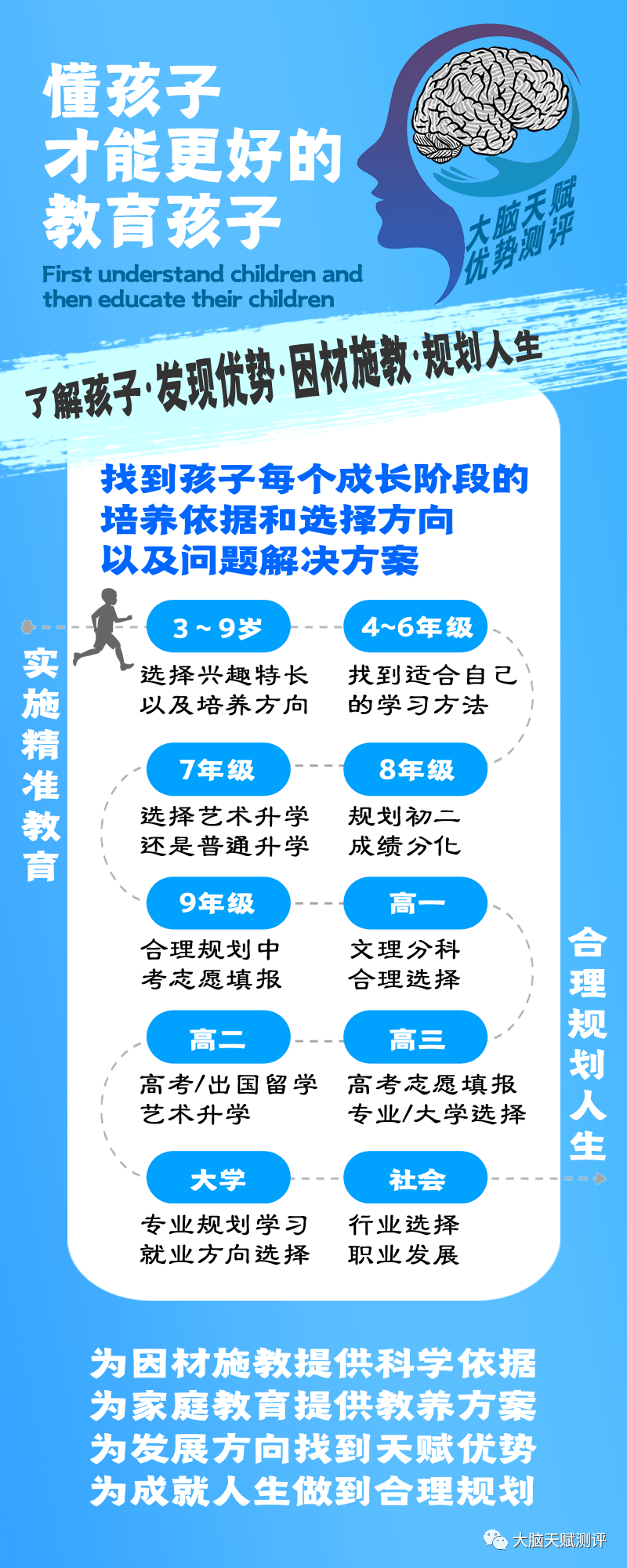 帮助父母全面认知孩子的天性,了解大脑先天优势及不足,扬长补短,结合实际情况发挥最大优势,科学选择发展兴趣,因材施教,让孩子赢在起跑线上,给孩子一个快乐童年。
