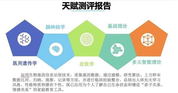 天赋测评是依据《皮纹学》、《胚胎学》、《脑神经学》、《多元智能》、《儿童心理学》,通过观察、记录、比对、分析的方法,加上临床经验的整合来评量个人先天潜能的一套科学检测系统。