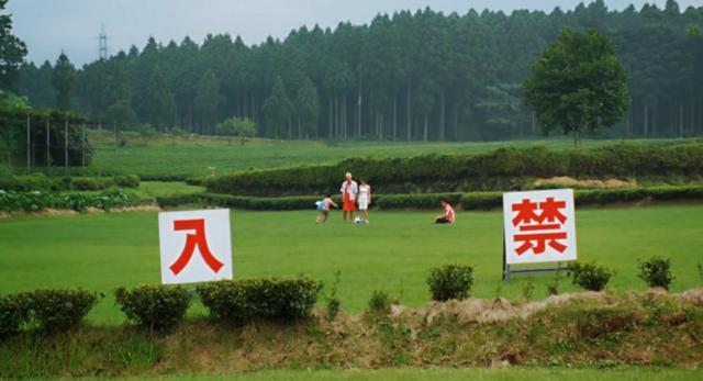 搭载正男、菊次郎的小情侣,在途中停靠休息时,两人真诚地陪着正男玩耍,扔苹果,跳奇怪的舞蹈,最后还送了正男一个带着天使翅膀的小书包。有个很细致的镜头,在几个人的嬉笑中镜头逐渐拉远,赫然出现了个很大的牌子:禁止进入。从规则的角度,他们的行为是“错误的”,但正男的年幼,给了大人们一种“玩性”,激发了童心,就像为了玩耍而恶作剧的小孩子,由着心性疯了一回。与其说是陪正男玩,不如说是借以放飞内心那部分天真的自我。