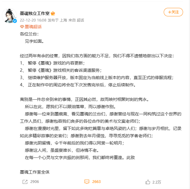 文学主题国风手游《墨魂》20 日发布公告,表示由于各方面能力不足,将暂停游戏的内容更新以及游戏相关的客诉渠道服务;会继续维护服务器开放,直至正式的停服流程;目前正在制作中的周边会在下次发售完毕后,停止后续制作。