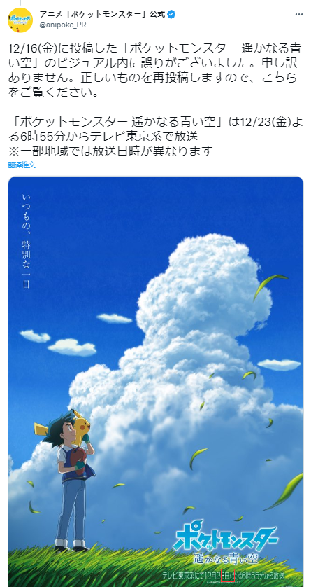 12 月 16 日,《宝可梦》动画宣布推出特别篇「ポケットモンスター 遥かなる青い空」,眼尖的观众当即发现海报底部的 12 月 23 日被写成了“12 月 23 月”,并且在官推评论区提醒多次。