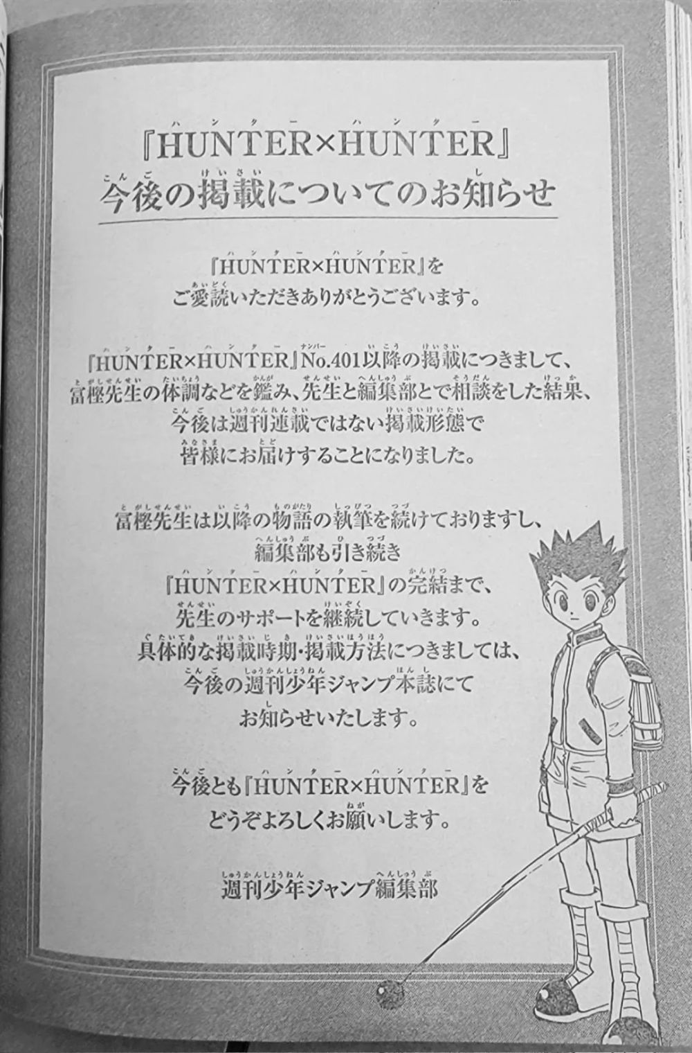 《全职猎人 》漫画由于 富坚义博 身体原因,第 401 话及后续篇章将暂时停更,具体回归时间未定。编辑部表示之后的连载将不再以周更形式进行。