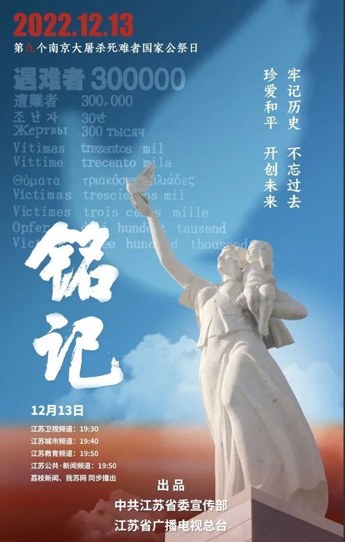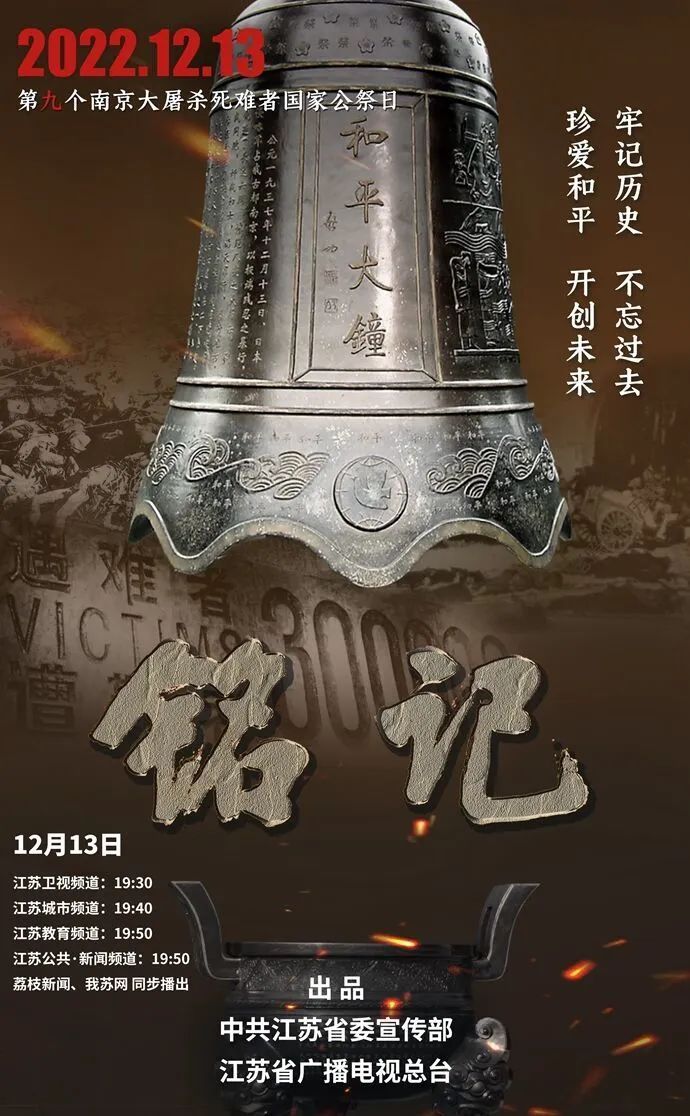 本片将于12月13日19:30起在江苏卫视播出,江苏城市频道19:40起播出,江苏教育频道和江苏公共·新闻频道19:50起播出,荔枝新闻、我苏两网两端同步推出。传承记忆,祈愿和平,敬请收看!