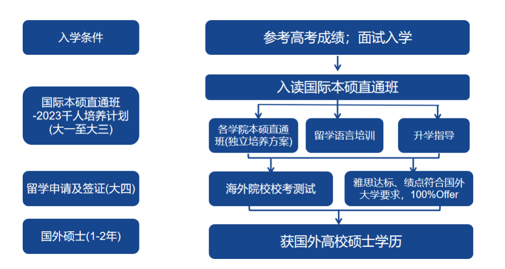 为积极响应国家推动构建人类命运共同体的重大发展理念,为社会培养更多通晓国际规则的国际化、应用型人才,我校积极构建全球化育人体系,携同海外知名高校开展“国际本硕直通培养计划”,帮助学生实现“国际名校、本硕直通”的目标(因此又称“国际本硕直通班”)。
