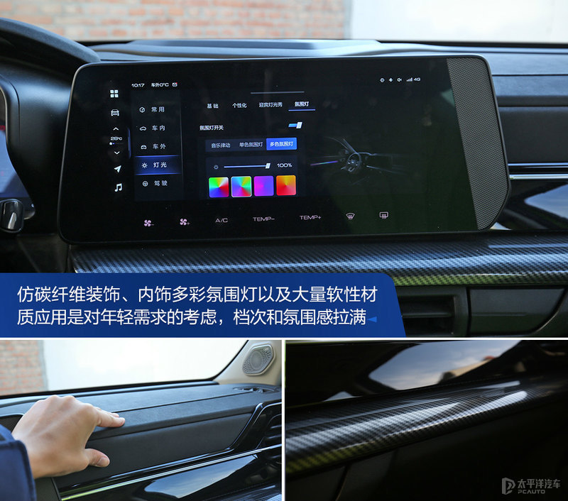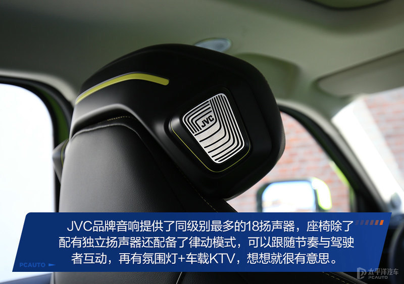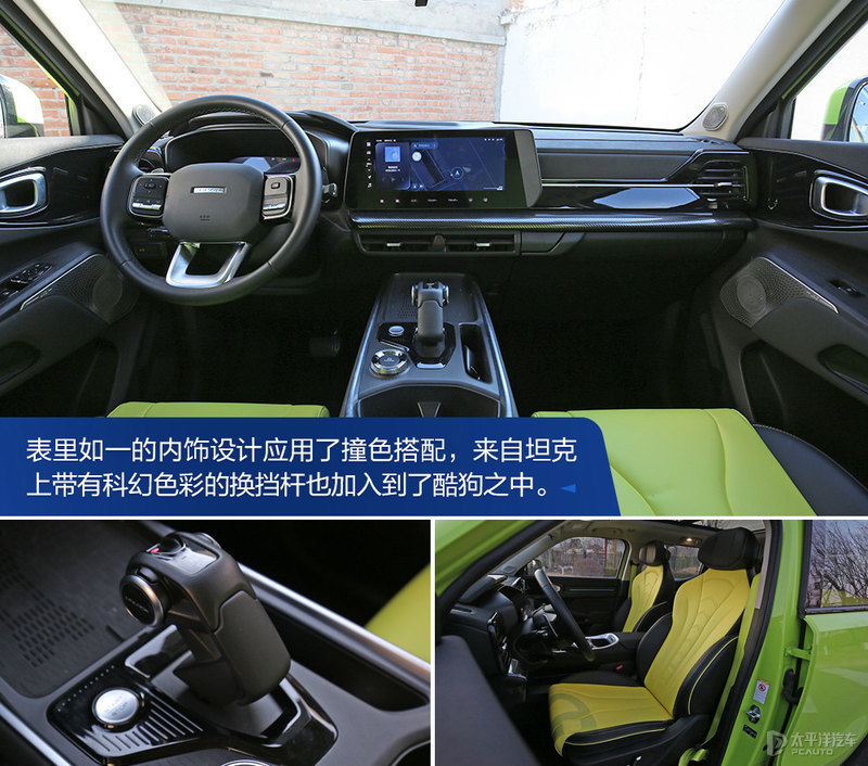 酷狗内饰用料还是非常实在的,车内采用了大量的软性材质,还配以仿碳纤维装饰来营造运动氛围,尤其是当你看到荧光色的桶装座椅、安全带以及配备了换挡拨片之后,就能明白厂家为什么说是专为年轻人打造的产品了。而在配置方面,哈弗的车机系统已经很熟悉了,导航、语音控制、智能网联与第三方app应用等等车机功能都可以满足;不仅如此,酷狗还拥有同级中最多的JVC18扬声器的品牌音响;另外座椅头枕带有专属扬声器外,还加入了律动效果,氛围灯也可以根据音乐节奏变换颜色,先不说这东西土不土,至少在年轻人喜好上花心思了。