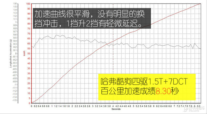 哈弗酷狗配备弹射起步模式,即便是双离合变速器也可以把起步转速拉起来,而这台1.5T高功率发动机低扭爆发是它的优势,起步冲刺就表现出了活跃的一面,整个加速过程非常有力,换挡时几乎不会有顿挫出现,轮胎也没有打滑的情况发生,所以最终我们获得了百公里加速最好成绩为8.3秒,相比之前我们测试过的1.5T高功率两驱版本8.99秒的成绩,四驱版本确实是要快很多。