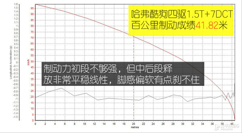 哈弗酷狗四驱版本比两驱版更重一些达到了1.7吨,在制动成绩表现上还是比较稳定的,之前两驱版本的制动成绩超过了42米,但这次四驱版本百公里制动最好成绩为41.82米。在我们测试过的哈弗SUV产品中40米上下是它们最长见的表现,所以这样的成绩并没有让人意外,但相比竞争对手我希望在加速表现越来越强的同时,制动成绩是不是也该重视起来提高提高。