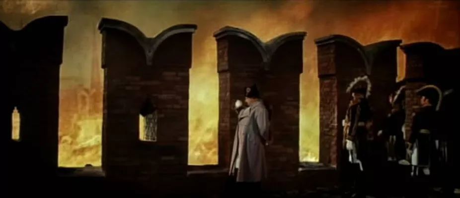所以,他们所到一地可不是一个摄制组那么简单,而是浩浩荡荡好几列火车。摄制组还在莫斯科州的捷利亚耶沃镇用实木等比复制了一个1812年的莫斯科,最后拍摄莫斯科大火就把它烧掉了。整部电影制作了9000套剧装,12000顶高筒军帽,20000粒纽扣。军工厂原样生产出了法式的武器,群众场面调动了两个军的兵力,超过15000名战士。战争场面还消耗了23吨炸药、4万公升煤油、15000枚手榴弹、2000只爆破筒以及1500发炮弹。嗯,战斗力爆表。