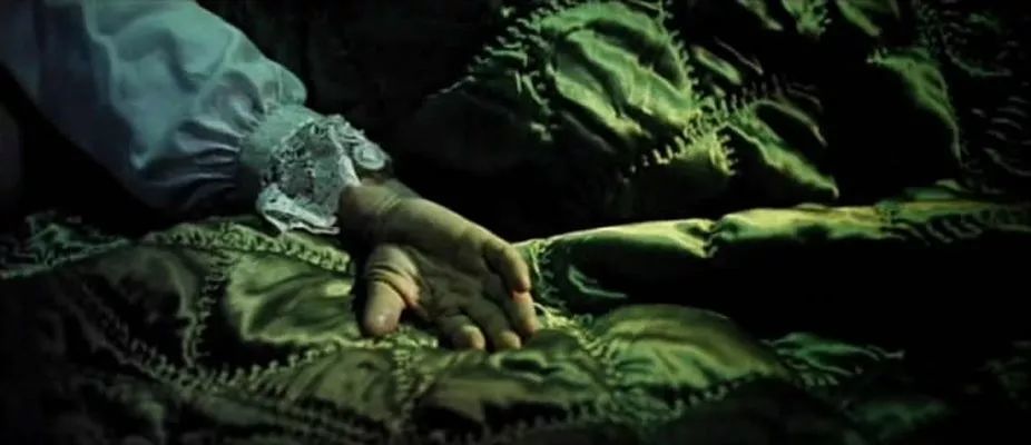 邦达尔丘克巧妙地使用了一组“手”的蒙太奇,将这些密集的信息完美地呈现出来:老伯爵优雅地“撩”的手;弥留中别祖霍夫伯爵想翻身,却不听使唤的手;几个女人抢夺装有遗书的皮包的手——如此紧张,却又如同芭蕾般优雅。皮埃尔坐在弥留的父亲床前,两人的叙事都使用了主观镜头,如此准确地将托尔斯泰笔下的既有隔阂,又充满亲情,儿子对死亡充满恐惧,父亲却已厌倦这人生的种种都真实传递了出来。