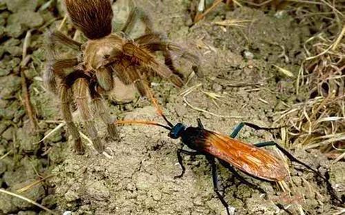 寄生蜂种类有很多种,其中一些体型比较大的、也比较凶悍的可以击倒巨人食鸟蛛这种的大家伙。食鸟蜘蛛看到它们时虽然不会马上认怂,它们会用前肢和毒螯来防卫,但这些寄生蜂却可以轻易的避开它的攻击,相反甚至蜘蛛的自卫动作,在它们眼中就是个致命的破绽。
