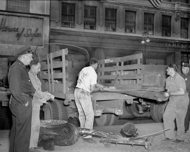 大约一个小时后,曼哈顿中城街道上的人们听到飞机的轰鸣声越来越大。不久,人们就惊恐地看见一架轰炸机突然从云层中出现,从摩天大楼之间闪过,然后一头扎进了帝国大厦的一侧。