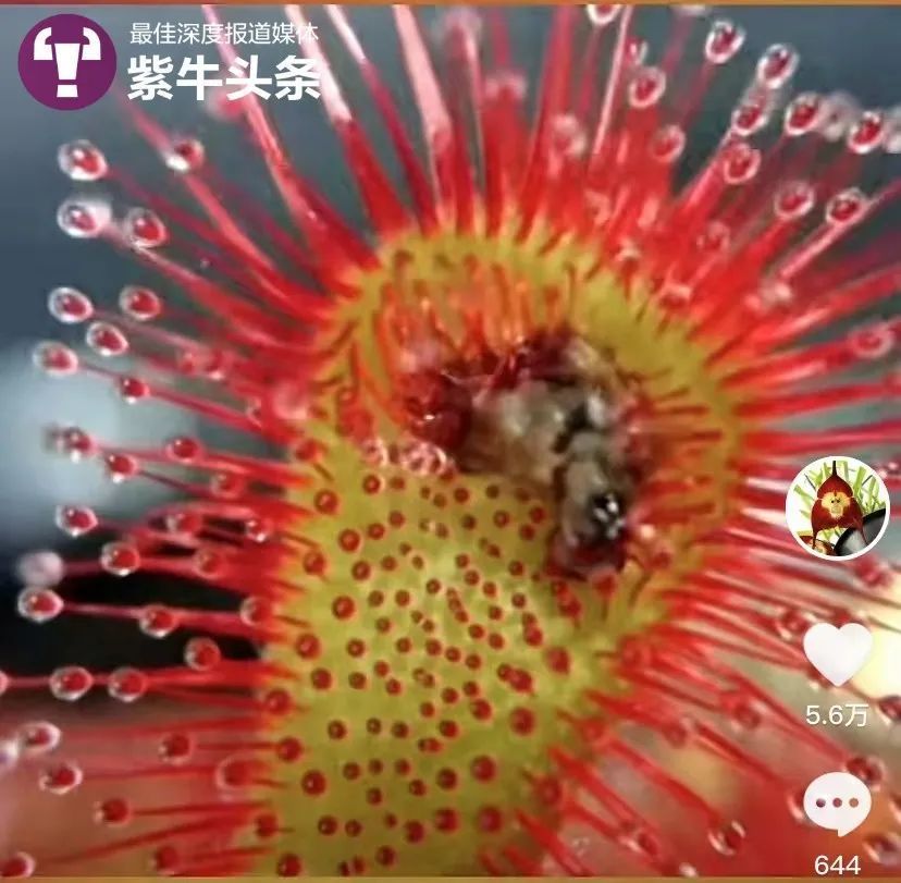 别看茅膏菜远瞧像一朵朵小花,但在陈奇奇的镜头下,它露出了“凶恶”的一面。视频中,茅膏菜的叶片就像一个个小勺子,上面有很多晶莹剔透的“露珠”。“对于小虫子来说,这完完全全就是个甜蜜的陷阱,看上去是香甜的蜜露,实际上却是非常黏的‘胶水’。虫子一旦落在上面,就会被粘住,然后茅膏菜的叶片会慢慢收拢,同时分泌消化酶将虫子吃掉。”她用生动的语言介绍。