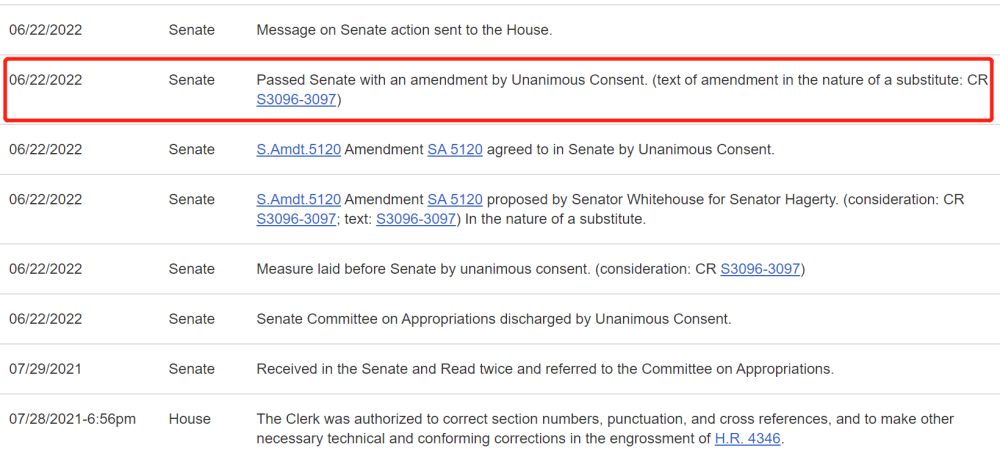 限于篇幅,本文不再赘述起前面两个法案的具体扯皮经过。一言以概括之,一度走的比较远的H.R.4521(流程走到了今年3月份)虽然一开始众议院倡导,但有关半导体振兴计划的核心部分都是来自参议院的S.1260植入版本。从美国国会官网查询H.R.4346走过的77个节点,可得知这牵扯到2800亿美元的法案能最终通过的关键节点是6月22日的修正案,如下图: