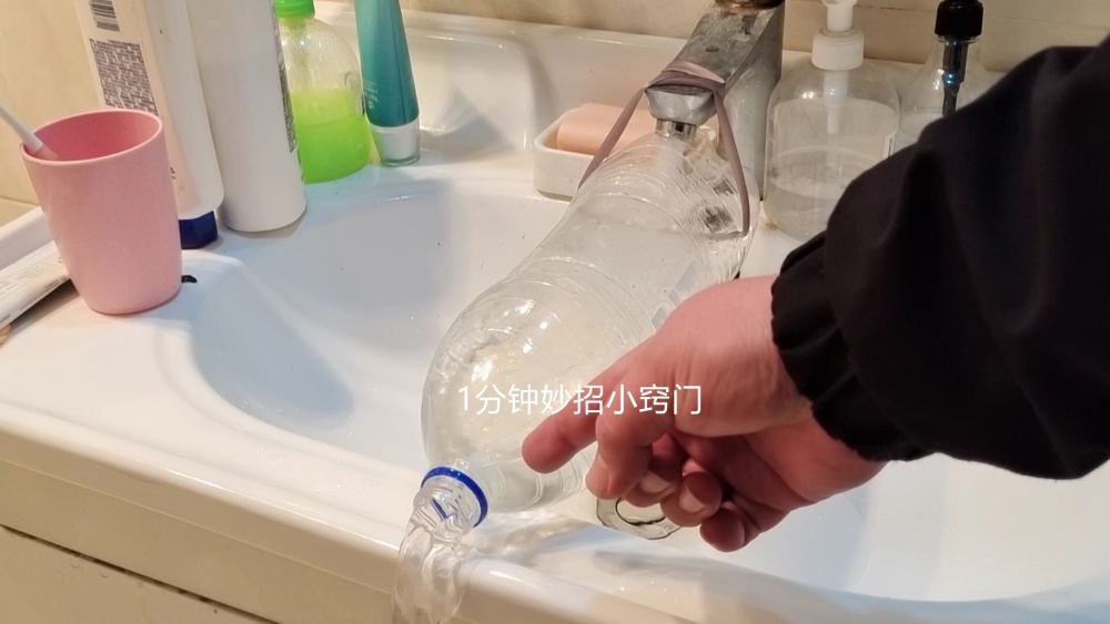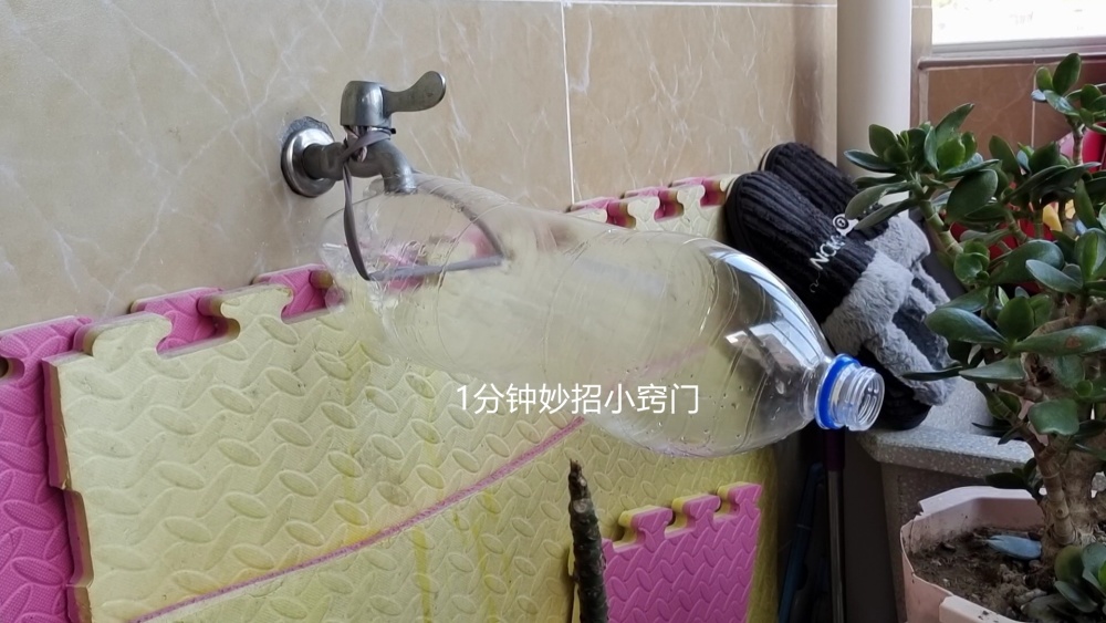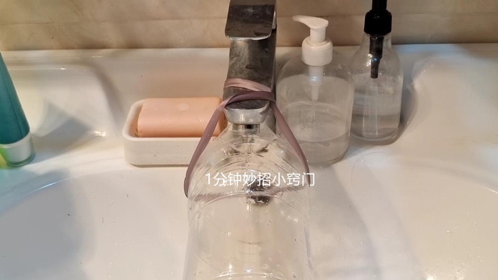像平时,我们在接水的时候,如果需要在洗手池这边接水,那么就可以利用这个方法来引流,而且塑料瓶用绳子捆绑,拆卸的时候也非常方便,用完拆下来就可以了,也不会占用洗手池的位置。