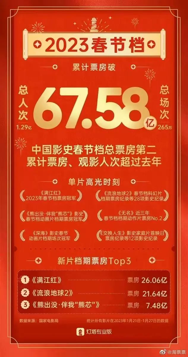 凭借对行业的深入洞察,李捷在去年就曾预言“2023春节档将强势回归”,事实正如他所料。2023年春节档总票房达到67.58亿,位列影史第二位,总观影人次接近1.3亿。