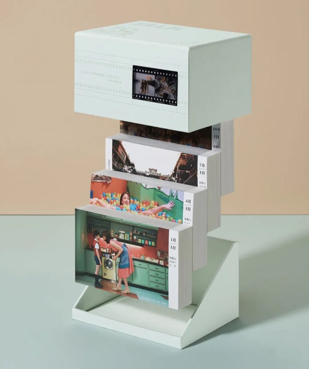 365个日子全部装在一个特别设计的盒子里,里面由几百张印有黑白日期的纸板組成,不需要胶水或其他粘合剂,只要两粒螺丝钉就能将它们联结在一起。