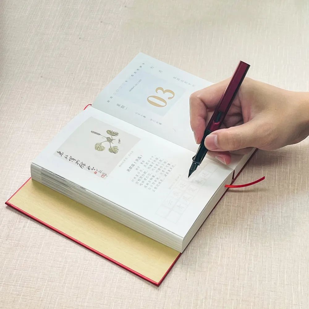 随日历附赠一支中国红钢笔,还有空白空间专门用来记录日常,相当于一个日记本,每日翻看每日记录每日修心。