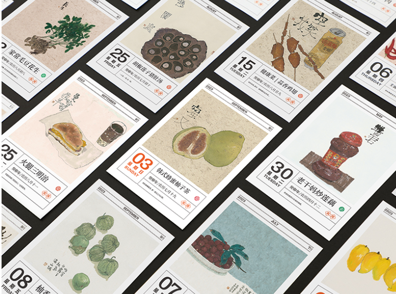 日历收录画家李知弥的系列国画,对应当季时令珍肴,每一张都长情而值得珍藏。