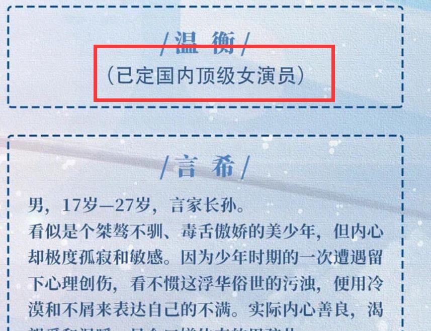 而关于女主,就连许多大V爆料也都说不好是谁呢,但我们发现这个上面注明的女主温衡的演员是“国内顶级女演员”出演的,既然是顶级女演员,大家肯定会想到周迅这种类型的演员,但那肯定是不可能的,所以关于女主的选角真的是引起了很多的争论呢。