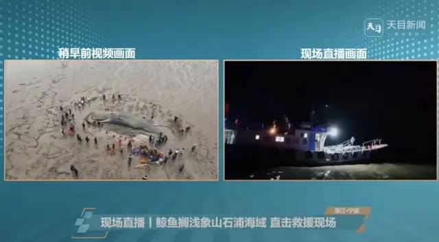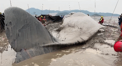 但由于体型和潮汐的问题,前两轮救援都以失败告终,19日晚上22:50海水达到将达到最高潮位,救援人员开展了第三轮的救援行动。
