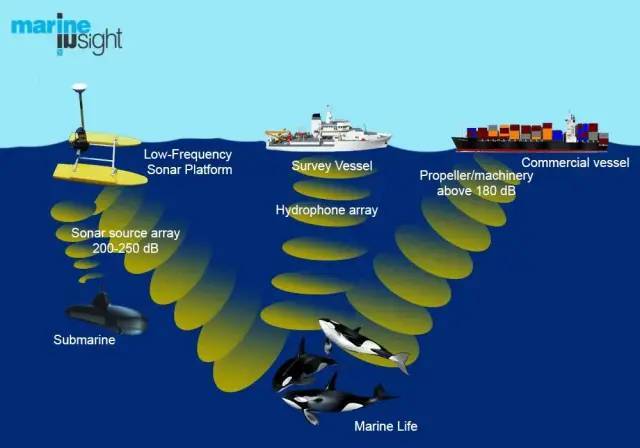 人类在海平面作业时,轮船的响声、军用的声呐等造成的噪音会对鲸鱼产生惊吓,让它们异常加速浮上水面,进而导致搁浅死亡。