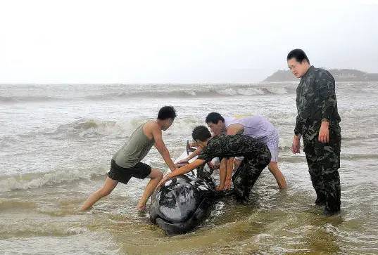 2014年7月19日,受台风“威马逊”影响,一条虎头鲸(长约3.2米、体重约4吨的黑色小鲸)受伤搁浅在广东阳江市海陵岛敏捷附近海域。