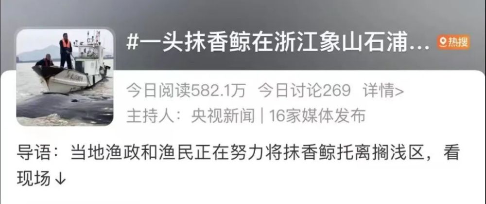抹香鲸搁浅当日,#一头抹香鲸在浙江象山石浦海域搁浅#冲上热搜。多家媒体进行救援现场直播。大家对于海洋生物保护的关注度越来越高,纷纷在线发声:望平安。