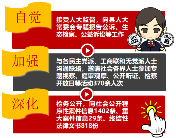 落实“少捕慎诉慎押”司法政策,依法决定不批捕87人,对无继续羁押必要的提出变更强制措施建议85人。落实“群众信访件件有回复”制度,共接收群众来信来访448件,全部做到7日内程序回复、3个月内办理过程或结果答复,结案率达100%。在全市率先建成检察听证室,先后公开听证案件16件,其中检察长率先主持民营企业经营人员和未成年人涉嫌犯罪拟作不起诉处理公开听证3件。开展下乡巡访20次,普法宣传210余场次。