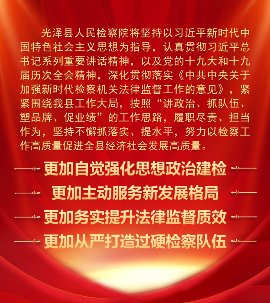 2017年以来,光泽县人民检察院在县委、上级检察院的正确领导下,在县人大及其常委会的有力监督下,在县大力支持、县政协民主监督以及社会各界关心下,坚持以习近平新时代中国特色社会主义思想为指导,深入学习领会习近平法治思想和习近平总书记来闽考察等系列重要讲话精神,认真贯彻落实党的十九大和十九届历次全会精神,增强“四个意识”、坚定“四个自信”、做到“两个维护”,贯彻《中共中央关于加强新时代检察机关法律监督工作的意见》,按照“讲政治、顾大局、谋发展、重自强”的检察工作总要求,紧紧围绕中心工作,以高度的政治自觉、法治自觉、检察自觉忠实履行法律监督职责,各项工作取得新进展。