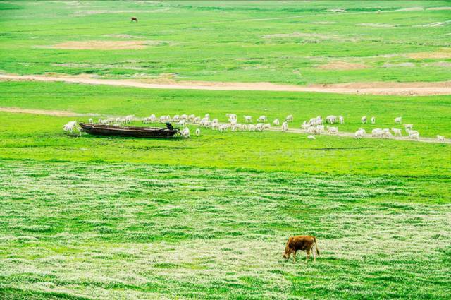鸭子戏于绿水间,牛羊如珍珠散落草地上,当你走进江边,似乎有坝上的感觉!