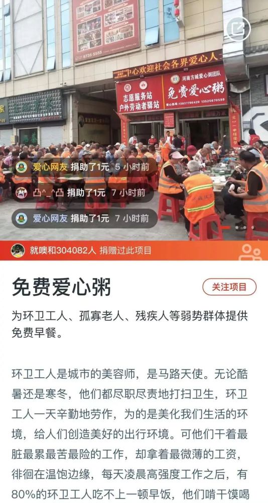 免费爱心粥项目在腾讯公益平台上,已筹集了5183768元,已帮助301125人,对于环卫工人的暖心帮助已初见成效;