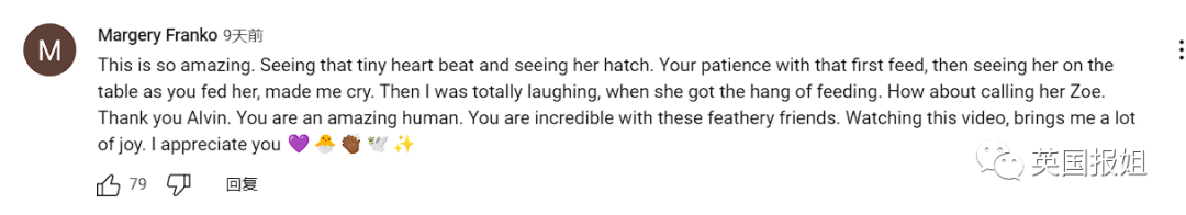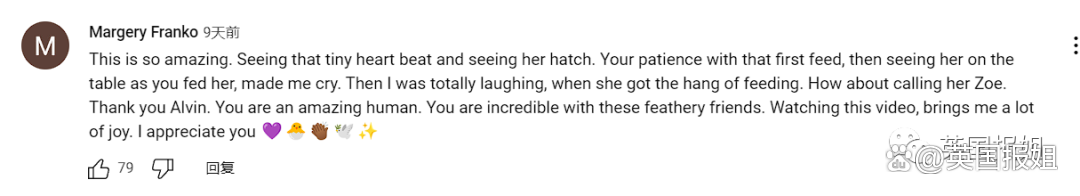 你和小鸟朋友在一起的样子真是不可思议,这个视频给我带来了很多快乐,我很感激你。”