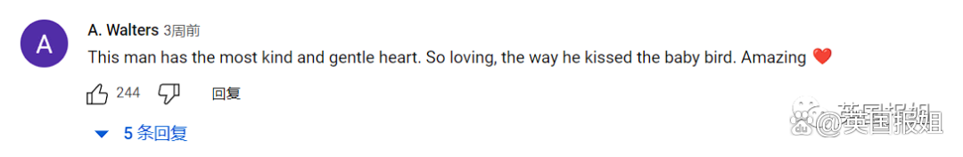 “这个男人有着最善良温柔的心。他亲吻小鸟的样子太有爱了。”