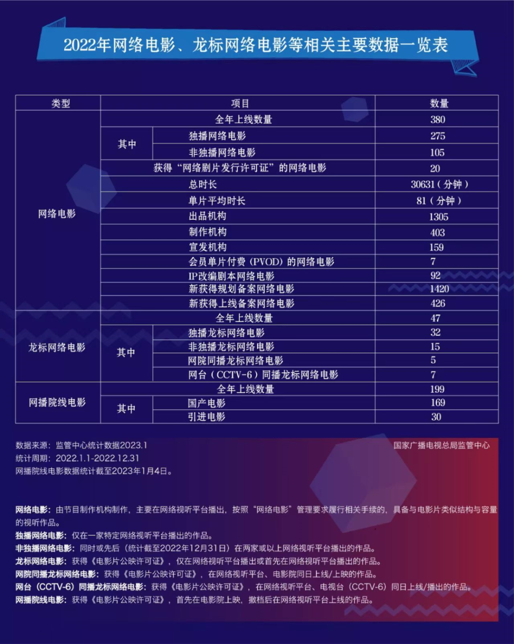 网络电影是视听内容的重要组成部分。据国家广电总局监管中心数据,2022年,全年上线网络电影380部,龙标网络电影47部。