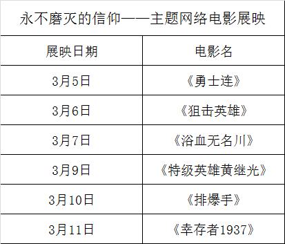 3月5日起,北京卫视将在黄金时间段陆续播出6部网络电影,分别是《勇士连》《特级英雄黄继光》《排爆手》《狙击英雄》《浴血无名川》《幸存者1937》。