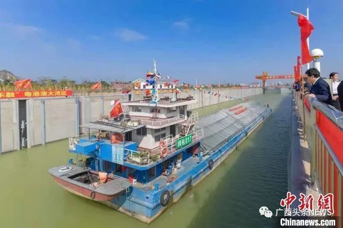 2020年12月1日西江航运干线贵港航运枢纽二线船闸工程通航。广西交通运输厅供图