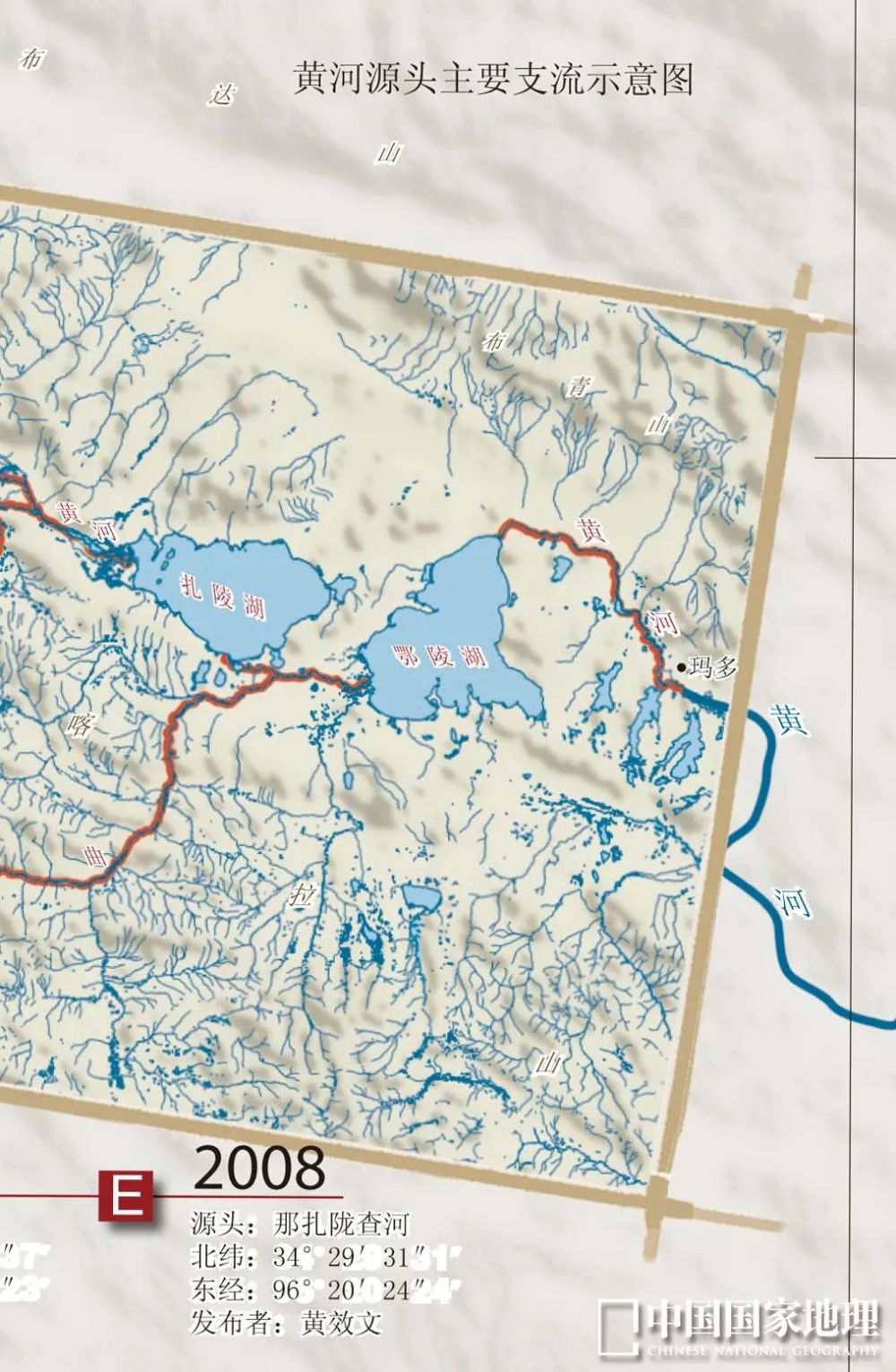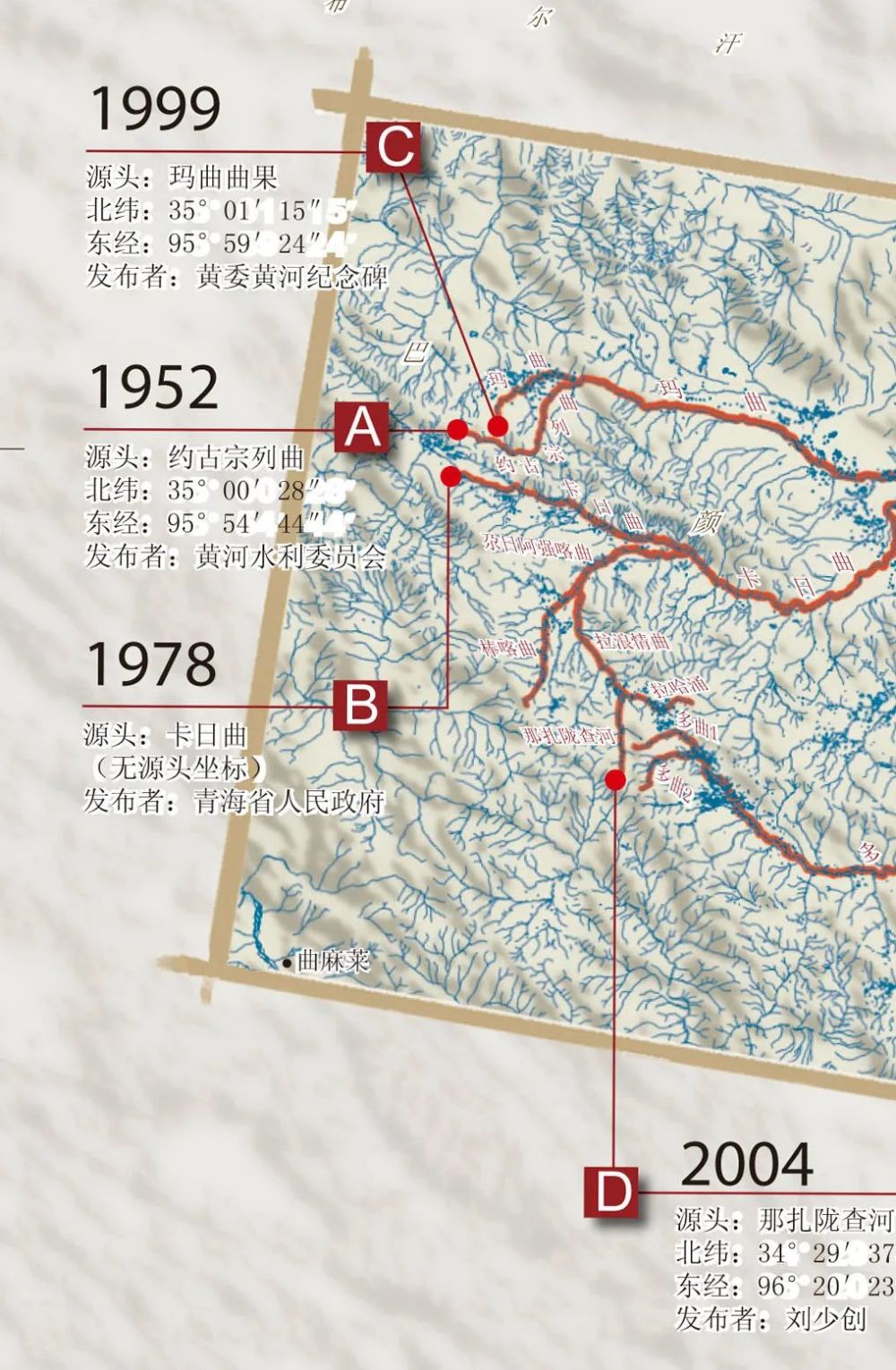 几次黄河源头探寻考察结果位置图。从现代考察来看,决定河源的原则依然首推河长,如果河长相差不多,就需要综合权衡其他原则,例如流量、面积、走向、比降等地理因素