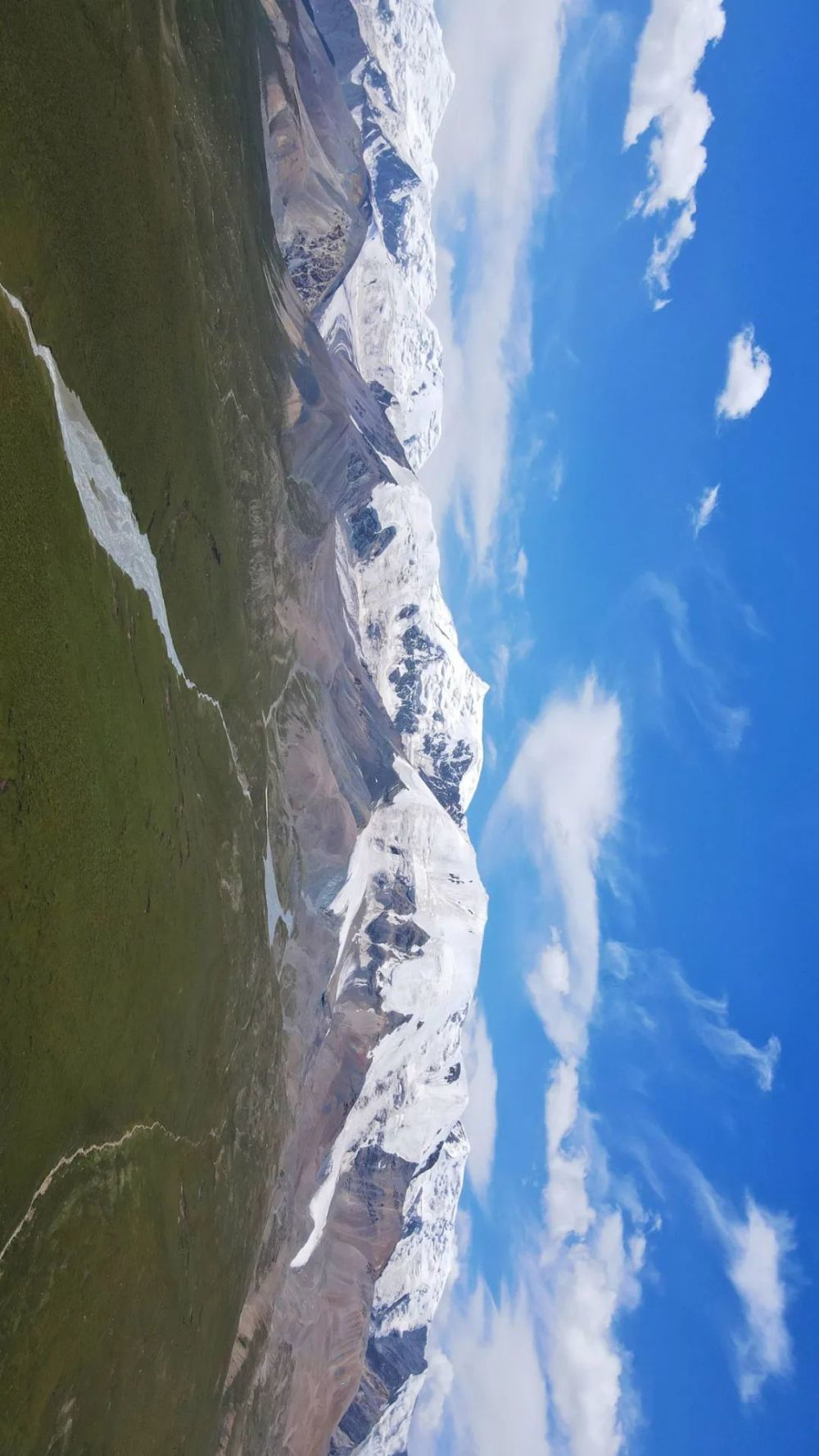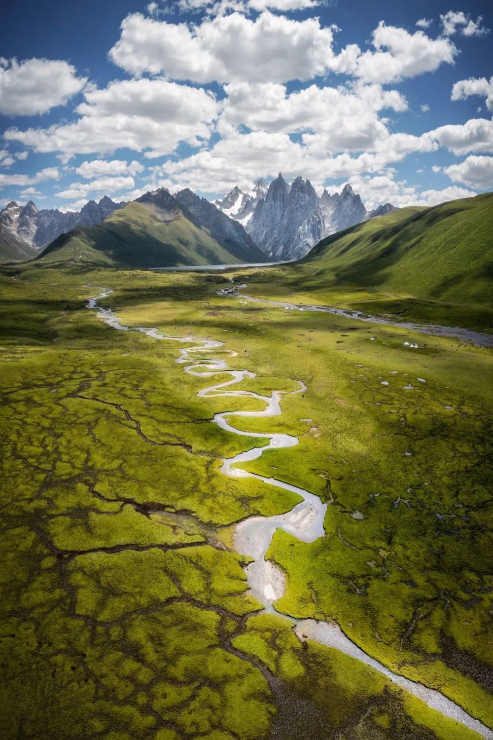 远处阿尼玛卿雪山,涓涓溪水从山里流出