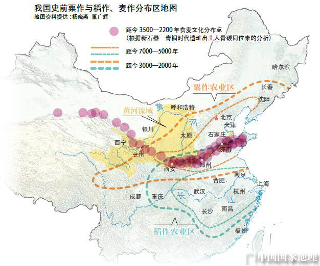 中国的农业起源有两个独立发展的脉络,一个是在长江中下游地区的南方稻作农业起源;另一个是沿黄河流域分布的北方旱作农业起源,所栽培的农作物主要有谷子(粟,小米)、糜子(黍,黄米)和大豆(菽)。
