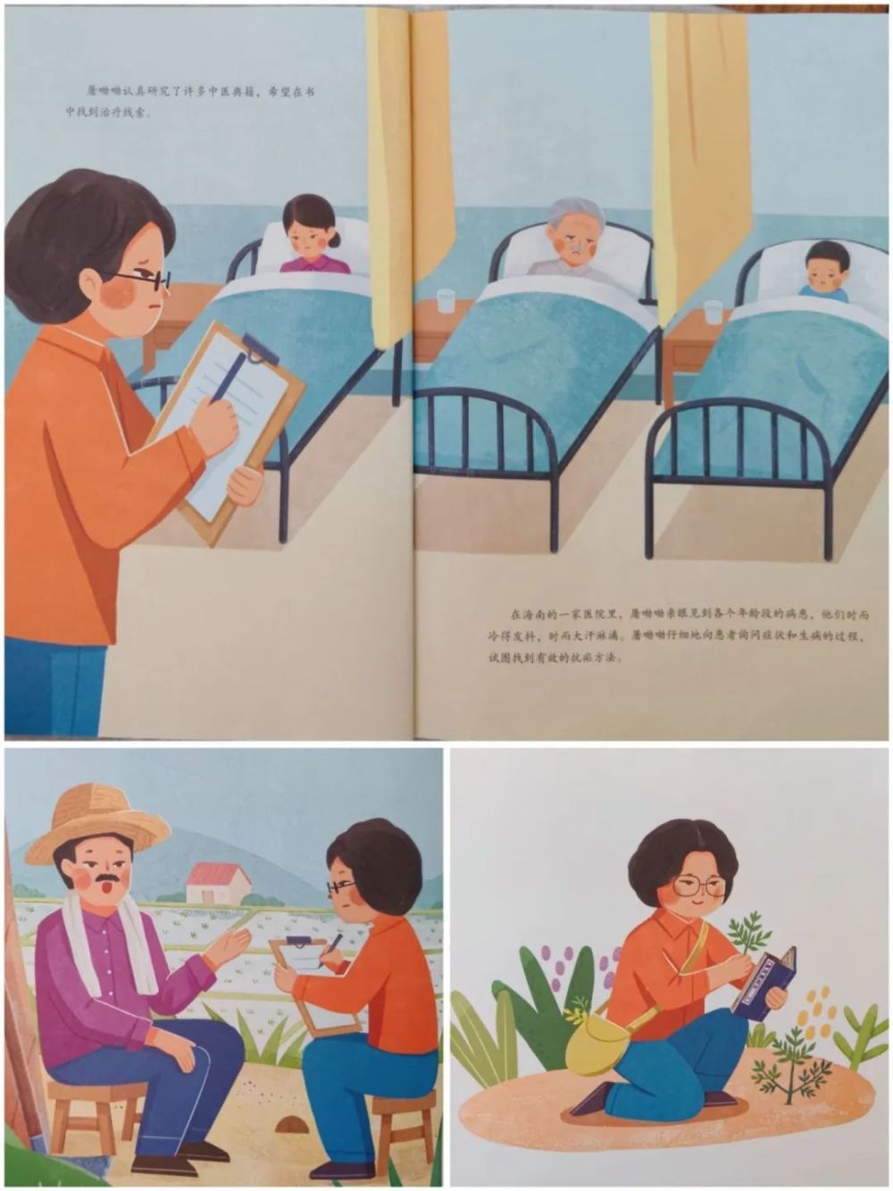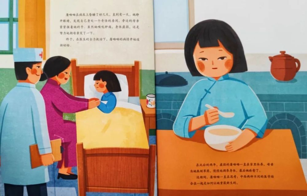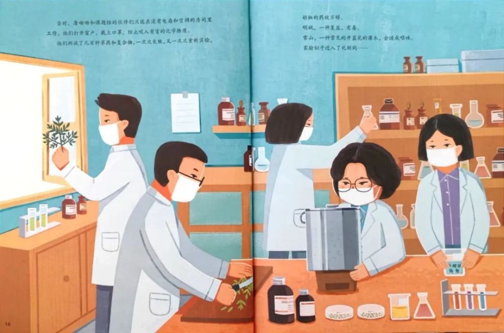 在《一株小草改变世界》这本绘本里,不仅讲到了童年生病经历对她科研方向选择上的影响,也详细讲述了屠呦呦从发现青蒿能治疗疟疾,到后来成功提取出青蒿素那艰辛又漫长的过程。