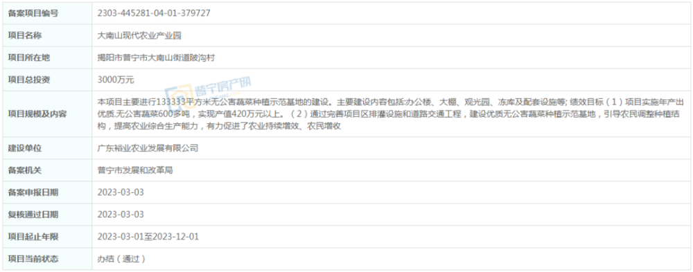 总投资3000万元,位于普宁市大南山街道陂沟村,本项目主要进行133333平方米无公害蔬菜种植示范基地的建设。主要建设内容包括:办公楼、大棚、观光园、冻库及配套设施等;绩效目标(1)项目实施年产出优质.无公害蔬菜600多吨,实现产值420万元以上。(2)通过完善项目区排灌设施和道路交通工程,建设优质无公害蔬菜种植示范基地,引导农民调整种植结构,提高农业综合生产能力,有力促进了农业持续增效、农民增收。建设单位为广东裕业农业发展有限公司,项目起止年限2023-03-01至2023-12-01
