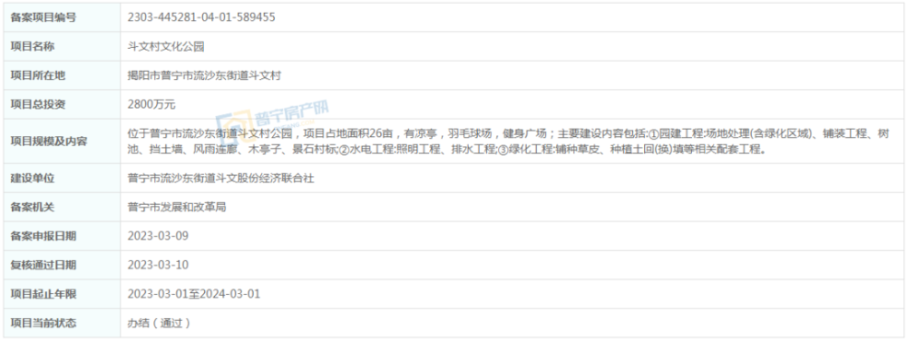 总投资2800万元,位于普宁市流沙东街道斗文村公园,项目占地面积26亩,有凉亭,羽毛球场,健身广场;主要建设内容包括:①园建工程:场地处理(含绿化区域)、铺装工程、树池、挡土墙、风雨连廊、木亭子、景石村标;②水电工程:照明工程、排水工程;③绿化工程:铺种草皮、种植土回(换)填等相关配套工程。建设单位为普宁市流沙东街道斗文经济联合社,项目起止年限2023-03-01至2024-03-01