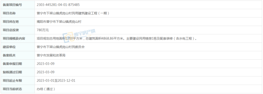 总投资780万元,位于普宁市下架山镇虎岗山村,项目规划总用地面积1200平方米,总建筑面积4868.86平方米。主要建设民用楼房1栋及配套装修(含水电工程)。建设单位为普宁市下架山镇虎岗山村民委员会,项目起止年限2023-03-01至2023-12-01