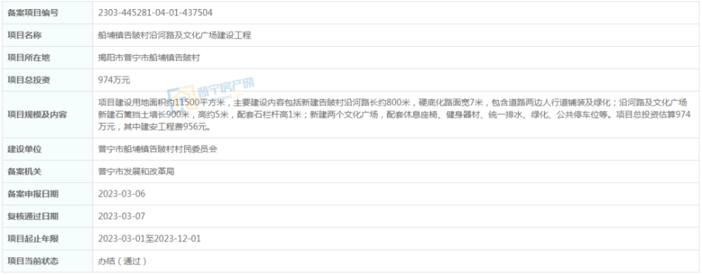 位于普宁市船埔镇告陂村,项目建设用地面积约11500平方米,主要建设内容包括新建告陂村沿河路长约800米,硬底化路面宽7米,包含道路两边人行道铺装悬疑片及绿化;沿河路及文化广场新建石篱挡土墙长900米,高约5米,配套石栏杆高1米;新建两个文化广场,配套休息座椅、健身器材、统一排水、绿化、公共停车位等。项目总投资估算974万元,其中建安工程费956元。建设单位为普宁市船埔镇告陂村村民委员会,项目起止年限2023-03-01至2023-12-01