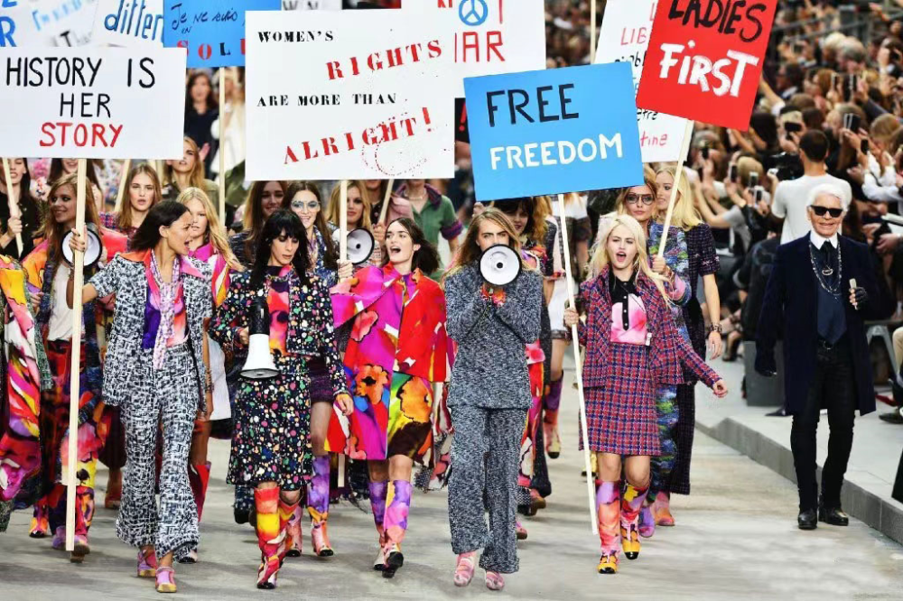 而香奈儿品牌也一直延续着Coco Chanel女士的先锋精神,2015香奈儿春夏高级成衣时装秀就曾为女性平权主义发声。