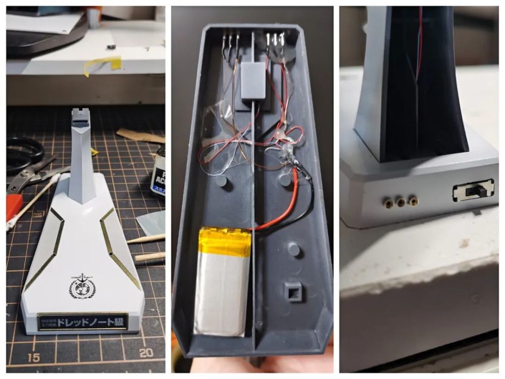电池放在舰身内部也是可以的,但是考虑方便以后充电和更换电池,最终把电池埋在底座,底座插销和舰体使用排针对接,可拆卸(忘记拍照)