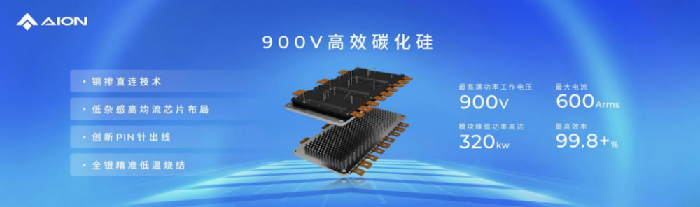 埃安还拥有全球最高900V碳化硅功率模块,经过了深度介入SiC产业链建设,自研封装设计,使得SiC模块回路杂感降低50%以上、热阻降低约25%、芯片通流能力提升10%以上、功率循环寿命提升约100%。并且可以充分发挥碳化硅的高耐压、高功率密度、高效率特性,助力夸克电驱实现最高满功率工作电压900V,峰值功率高达320kw以上,最高效率超99.8%,位居行业顶尖水平。