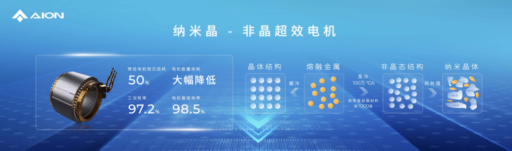 第一个就是全球首个“纳米晶-非晶”超效率电机,纳米晶-非晶材料冷却速度高达100万℃/s,较铁基硅钢材料快1000倍,具有原子无序排列、无晶粒、无晶界的微观特性。由于这一材料铁损系数远低于铁基硅钢等电工钢,用它来制作电机铁芯,可以降低电机50%铁芯损耗,从而有效降低电机能量损耗,将电机工况效率提升至97.5%,让电机最高效率达到98.5%。