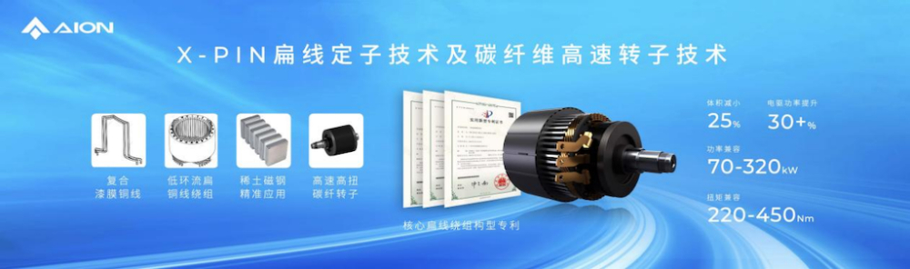 另外,埃安有行业首创X-PIN扁线绕组,它融合了自主专利的X-PIN扁线定子技术和碳纤维高速转子技术,在缩小25%体积的情况下,将电驱功率提升30%以上,这也让未来的产品有了更多的可能性。